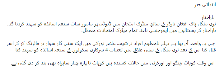 HomeLatest Newsپار اچنار سکول میں فائرنگ 6 اساتذہ قتل National پار اچنار سکول میں فائرنگ 6 اساتذہ قتل By Muhammad Arif مئی 4, 2023 0 563 Share FacebookTwitterPinterestWhatsApp Share FacebookTwitterPinterestWhatsApp Previous articleالیکشن میں تاخیر سے متعلق کیس کی سماعت کل کیلئے فکس کردی گئیNext articleAli Amin Gandapur is released from Sukhur Jail. Muhammad Arifhttp://247paknews.com RELATED ARTICLES National پاک سوزوکی نے موٹرز نے پاکستان میں پلانٹ بند کرنے کا اعلان کردیا۔ جون 19, 2023 National پی ٹی آئی کے ساتھ جوکچھ ہو رہا ہے وہی اب جماعت اسلامی کے ساتھ ہونے لگا ہے۔ جون 15, 2023 National مہاتر محمد کا عمران کےنام پیغام اور نیک طمناو کا اظہار۔ جون 15, 2023 LEAVE A REPLY Cancel reply Comment: Please enter your comment! Name:* Please enter your name here Email:* You have entered an incorrect email address! Please enter your email address here Website: Save my name, email, and website in this browser for the next time I comment. - Advertisment - Most Popular پاک سوزوکی نے موٹرز نے پاکستان میں پلانٹ بند کرنے کا اعلان کردیا۔ جون 19, 2023 پی ٹی آئی کے ساتھ جوکچھ ہو رہا ہے وہی اب جماعت اسلامی کے ساتھ ہونے لگا ہے۔ جون 15, 2023 مہاتر محمد کا عمران کےنام پیغام اور نیک طمناو کا اظہار۔ جون 15, 2023 بیرونی ملک پاکستانی بےشرم لوگ ہے یہ صرف لاشے دفنانے پاکستان اتے ہے۔ خواجہ آصف جون 15, 2023 Load more Recent Comments